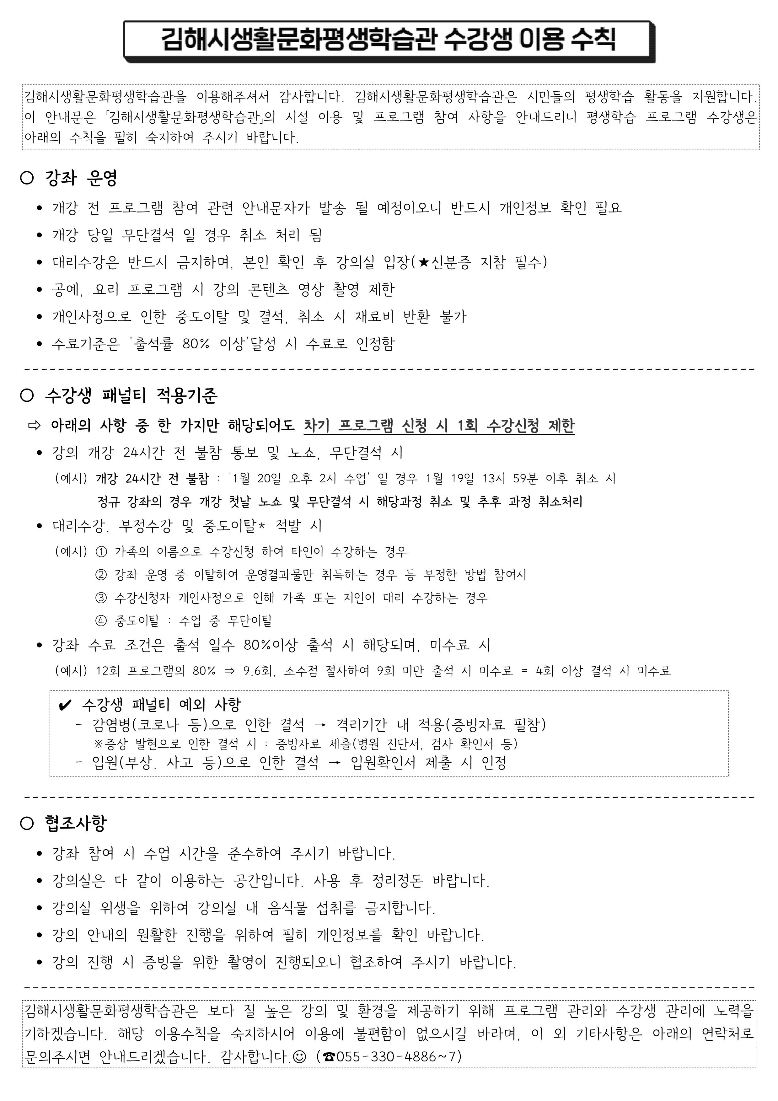 ★프로그램 신청 시 수강생 이용수칙을 반드시 확인 바랍니다.(※패널티 적용기준 확인 필수!) ▶이용수칙 미숙지로 발생하는 불이익은 기관에서 책임지지 않습니다