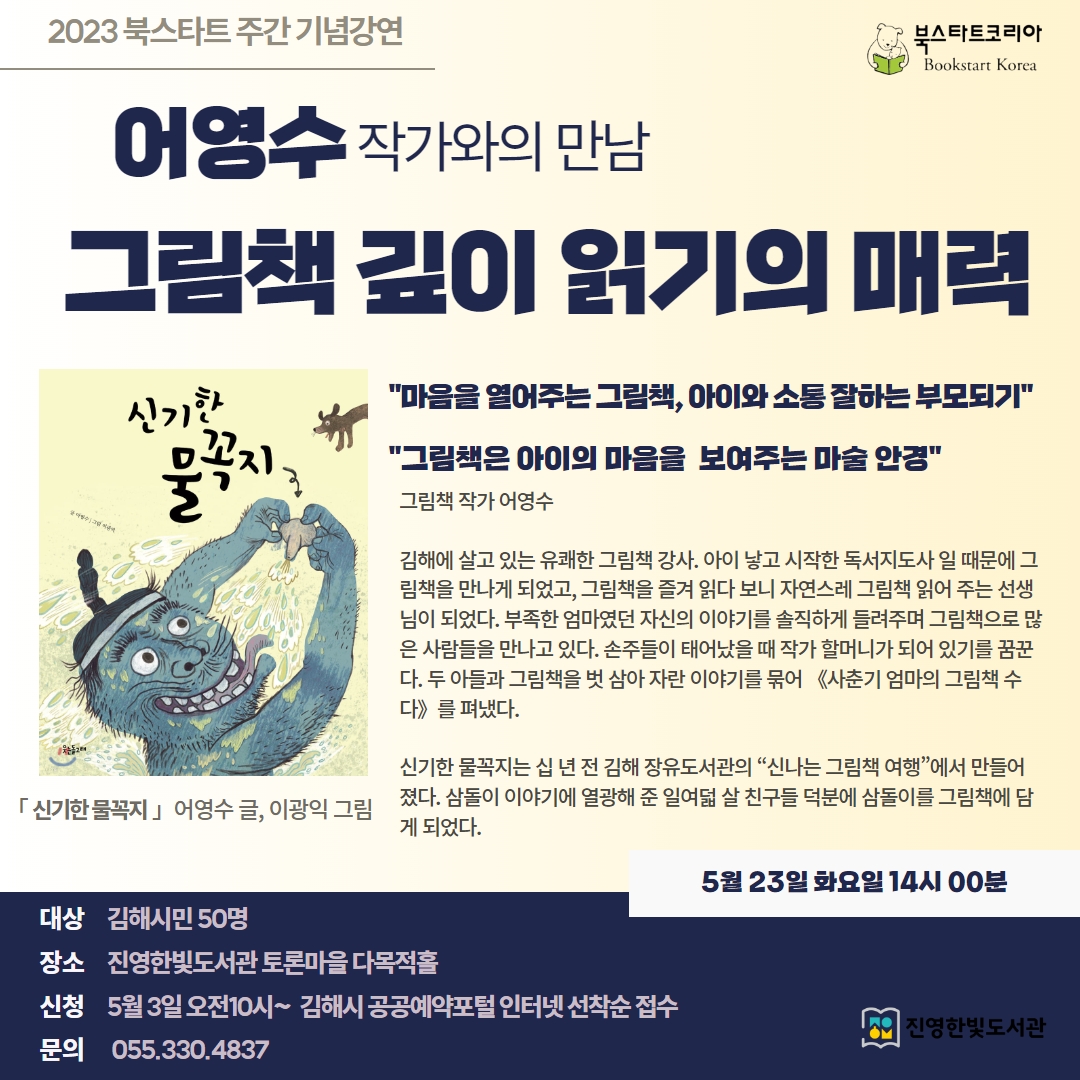 2022년 올해의 책 "신기한 물꼭지"의 저자 어영수 작가님과 함께 그림책으로 아이와 소통하는 법을 알아보는 시간을 가질 예정입니다.