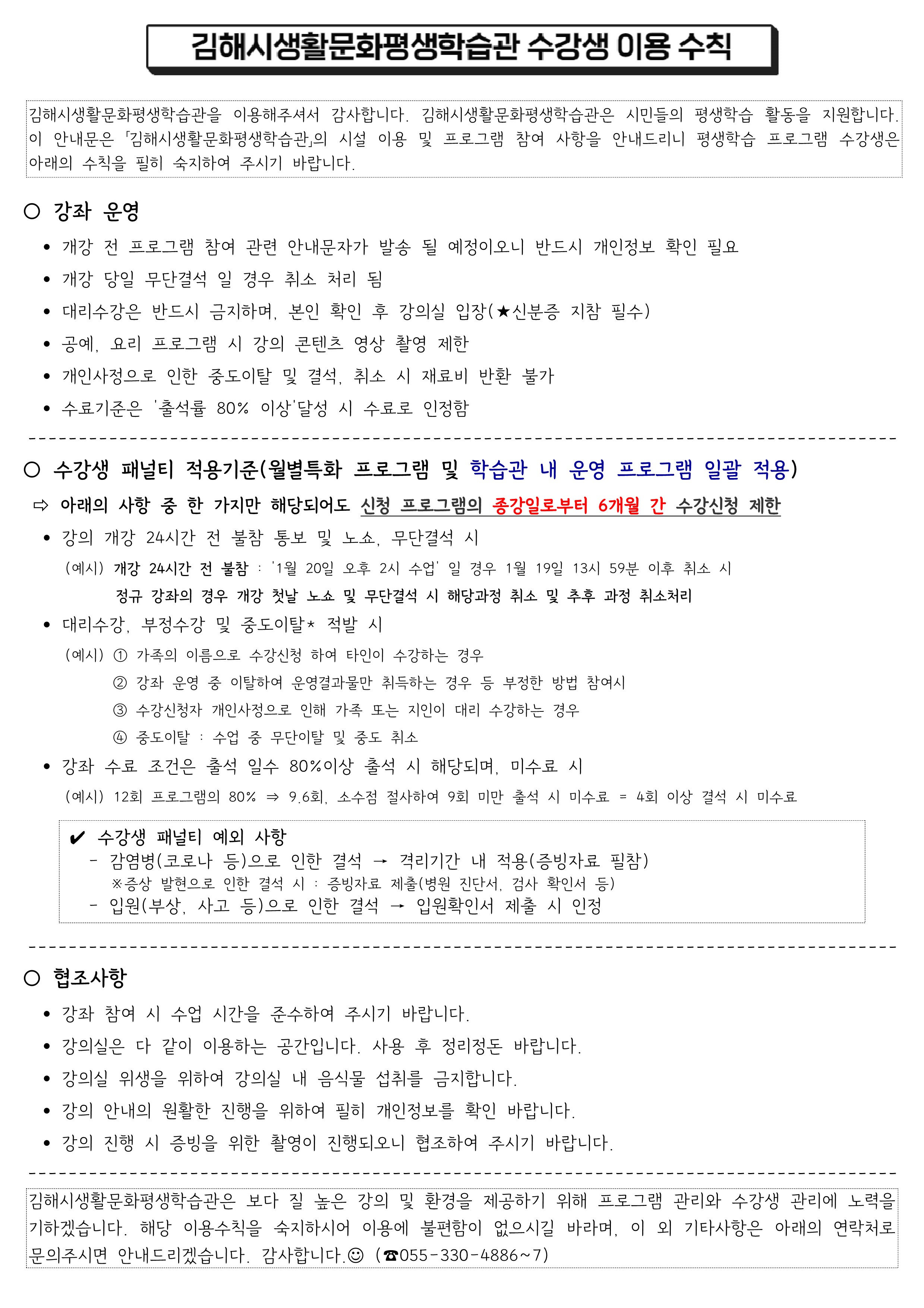 ★프로그램 신청 시 수강생 이용수칙을 반드시 확인 바랍니다.(※패널티 적용기준 확인 필수!) ▶이용수칙 미숙지로 발생하는 불이익은 기관에서 책임지지 않습니다