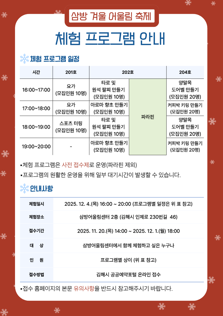 - 행사로 인해 삼방어울림센터 주차장 이용은 불가합니다. 대중교통 및 인근 공영주차장 이용바랍니다.