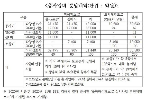 “인근 개발사업자(김해관광유통단지, 율하도시개발사업, 구관동 도시개발사업, 이엘아파트 등)와 사업비 부담 협의 지속 추진하여 시비부담 최소화 노력”