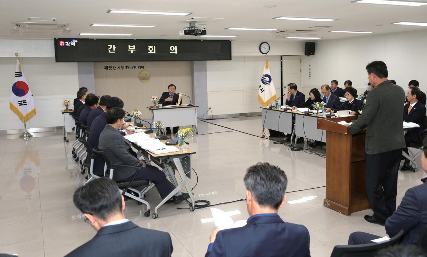 시는 지난 4월 8일 김해시장과 실ㆍ국장 이상 간부들이 참석한 가운데 간부회의를 갖고 '산불 예방 및 해빙기 안전 관리', '지방 재정 신속 집행', '2023 전국체육대회', '제로페이 공공분야 활성화 대책' 등 시민 생활과 밀접한 관계가 있는 다양한 시책에 대해 논의했다.