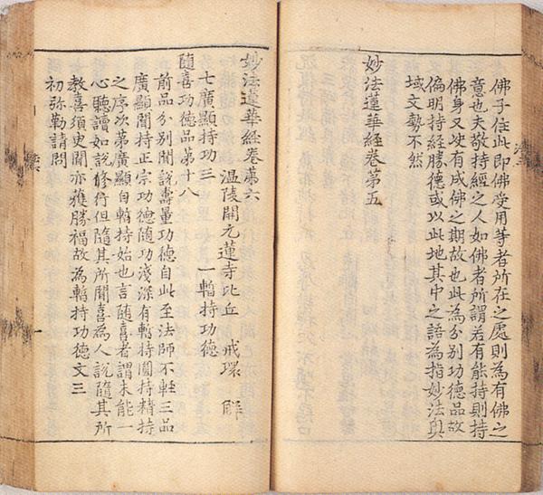 묘법연화경 권4∼7(1988)은 천태종의 근본경전으로 줄여서 ‘법화경’이라고 부르기도 하며, 부처가 되는 길이 누구에게나 열려 있다는 것을 중심사상으로 하고 있다. 이 책은 태종 5년(1405)에 성달생·성개 형제가 죽은 아버지의 명복을 빌기 위해 옮겨 적은 불경을 신문(信文)이 목판에 새겨 찍어낸 것이다. 닥종이에 찍은 목판본으로 4권을 하나의 책으로 엮었으며 책의 크기는 세로 26.8㎝, 가로 16㎝이다. 청색 비단으로 싼 표지가 남아 있고, 제목은 주홍색 바탕 위에 금색 글씨로 썼다.