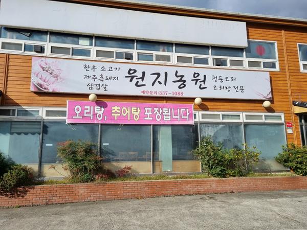 원지농원은 제주 흑돼지 생삼겹살, 청동오리 소금구이, 청동오리 양념구이, 오리탕, 추어탕 등 다양한 요리의 메뉴가 있습니다. 모든 재료를 100% 국내산만을 취급하며, 계절에 따른 쌈 종류와 식혜를 직접 만들어 직접 만들어 제공하고 있습니다. 또한, 훤히 보이는 깨끗한 주방은 손님들로 하여금 신뢰를 주고 있으며, 약 100평 규모로 넓은 단체석과 방으로 된 개별 좌석을 통해 단체행사 및 접대를 하기에 안성맞춤입니다.