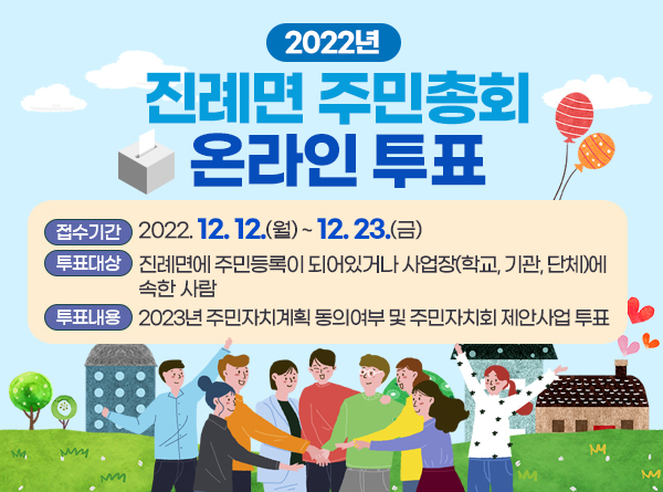 2022년 진례면 주민총회 온라인 투표 ○ 접수기간 : 2022. 2022. 12. 12.(월) ~ 12. 23.(금) ○ 투표대상 :진례면에 주민등록이 되어있거나 사업장(학교, 기관, 단체)에 속한 사람 ○ 투표내용 : 2023년 주민자치계획 동의여부 및 주민자치회 제안사업 투표