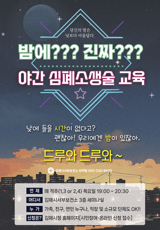 낮시간대 시간이 부족한 직장인 및 일반인을 위해 「야간 심폐소생술 교육」을 운영합니다. 가족, 친구, 연인 등 누구나 신청가능하오니 많은 참여 바랍니다. ◯ 일시 : 2023.10.12.(목) 19:00~20:30 ◯ 장소 : 김해시서부보건소 3층 세미나실 ◯ 대상 : 8세 이상 김해시민 누구나 ◯ 교육내용 - 심폐소생술 일반 교육과정(100분) : 심폐소생술 이론 및 실습 ◯ 기타안내 - 교육 후 수료증 발급 - 김해시서부보건소 옆 주문도서 주차장 이용 가능