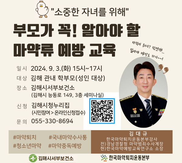 최근 인터넷, SNS를 통해 마약류를 유통, 판매, 마약중독자가 거리 활보하여 일반 시민이 피해를 입는 등 마약사범이 급증하고 있으며 비만치료제, 수면마취제 등 의료용 마약류의 오남용으로 인해 본인도 모르는 사이 마약에 중독되는 사례 발생 등 마약류 중독이 사회적 문제로 대두되고 있습니다. "내 주변의 일은 아니겠지", "우리 아이는 절대 그럴리 없어"라고 생각하실 수 있지만 마약은 우리도 모르게 이미 스물스물 가까이 다가와 있는 것도 사실입니다. 누구에게도 예외란 없습니다. 뭐든지 알아야 예방도 하고, 소중한 내 자녀도 지킬 수 있습니다. 마약류 예방교육에 참석하셔서 마약류로부터 안전한 사회 만들기에 동참해주세요!