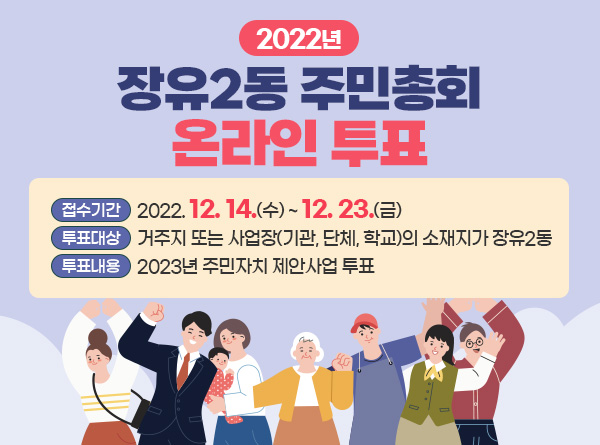 2022년 장유2동 주민총회 온라인 투표 ○ 접수기간 : 2022. 12. 14.(수) ~ 12. 23.(금) ○ 투표대상 : 거주지 또는 사업장(기관, 단체, 학교)의 소재지가 장유2동 ○ 투표내용 : 2023년 주민자치 제안사업 투표