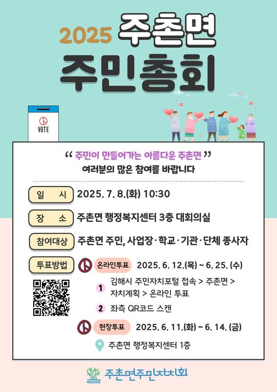 2025년 주촌면 주민총회 온라인 투표 ○ 투표기간 : 2025. 6. 12.(목) ~ 6. 25.(수) ○ 투표대상 : 주촌면 주민등록자, 주촌면 소재 사업장 종사자 또는 학교·기관·단체 속한 사람, 외국인등록대장 기록 되어 있는 사람 ○ 투표내용 : 2026년 주촌면 자치계획 및 주민참여예산사업, 2025년 주민자치회 주민참여예산사업 일부변경 동의 여부