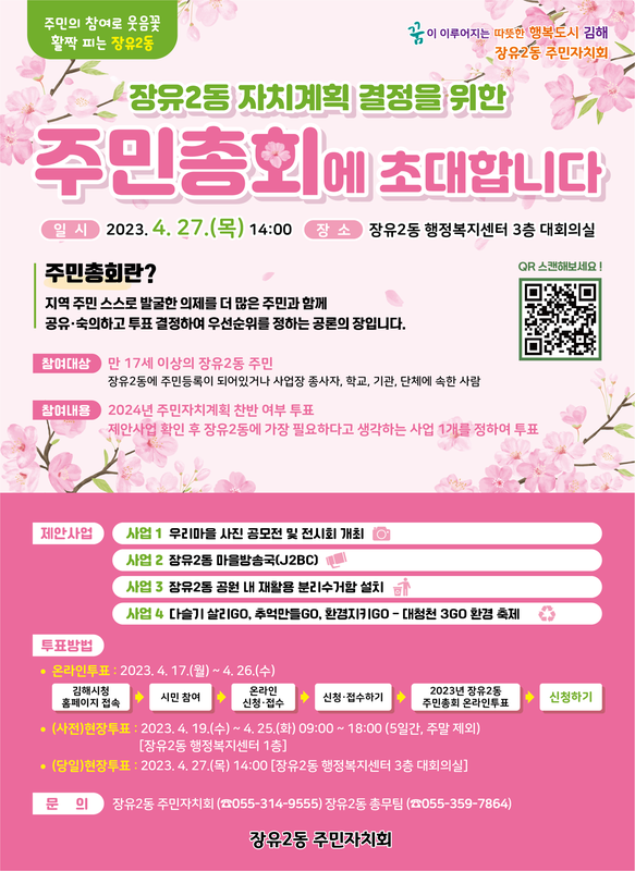 2023년 장유2동 주민총회 온라인 투표 ○ 접수기간 : 2023. 4. 17.(월) ~ 4. 26.(수) ○ 투표대상 : 거주지 또는 사업장(기관, 단체, 학교)의 소재지가 장유2동 ○ 투표내용 : 2024년 주민자치계획 동의 여부 및 주민자치 제안사업 투표