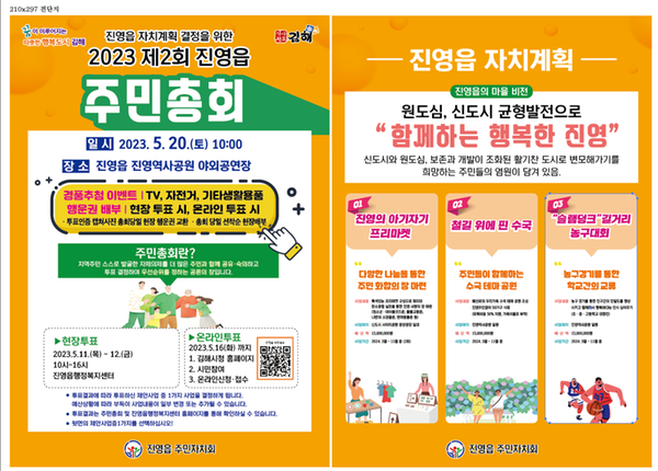 2023년 진영읍 주민총회 온라인 투표 ○ 접수기간 : 2023. 5. 1.(월) ~ 5. 16.(화) ○ 투표대상 : 거주지 또는 사업장(기관, 단체, 학교)의 소재지가 진영읍인 사람 ○ 투표내용 : 2024년 진영읍 자치계획 동의여부 및 주민자치회 제안사업 투표 ○ 2023. 5. 20.(토) 진영역사공원 주민총회에 참석하시는 분들께는 경품 행운권을 배부해드립니다.(온라인 투표 완료 인증하시면 1장 더 드립니다~!) - 경품 TV, 자전거, 기타생활용품 등 다수