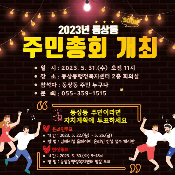 2023년 동상동 주민총회 온라인 투표 ○ 접수기간 : 2023. 5. 22.(월) ~ 5. 26.(금) ○ 투표대상 : 거주자 또는 사업장(기관, 단체, 학교)의 소재지가 동상동인 자 ○ 투표내용 : 2024년 주민자치계획 동의 여부 및 주민자치회 추진사업( 주민참여예산사업, 자치사업) 투표
