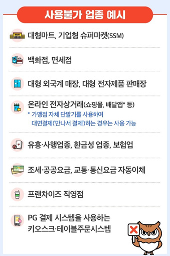 • 신용·체크·선불카드 → 사용불가 업종을 제외한 연 매출액 30억원 이하 매장