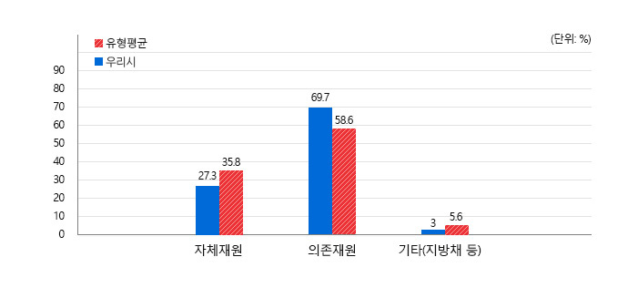 - 자체수입은 유형 지방자치단체 평균액(1조 1,018억 원)보다 4,268억원이 적으며, 이전재원은 유형 지방자치단체 평균액(1조 4,653억 원)보다 1,031억원 적습니다.