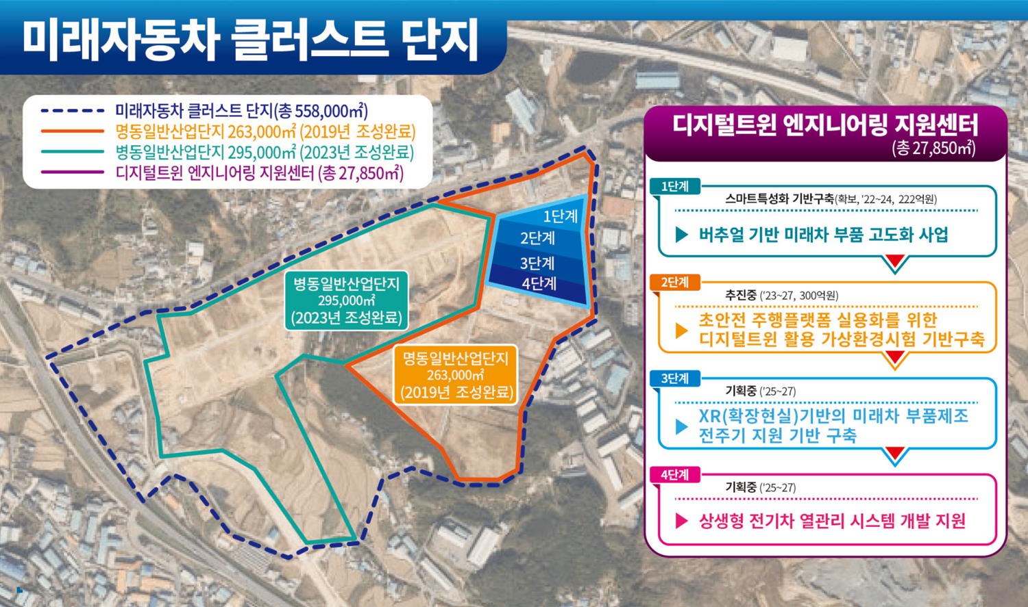 ① 미래자동차 통합성능 기반을 위한 엔지니어링 센터 구축 ② 주행 성능시험 장비 등 인프라 구축 및 기술개발, 기업지원 |