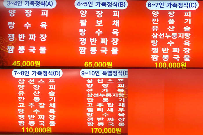 일반식사 메뉴 중 ‘삼선짬뽕’이 주 인기 메뉴이며 싱싱한 해산물들과 가리비 홍합 동죽 그리고 낙지까지 9,000원에 판매하고 있습니다.
