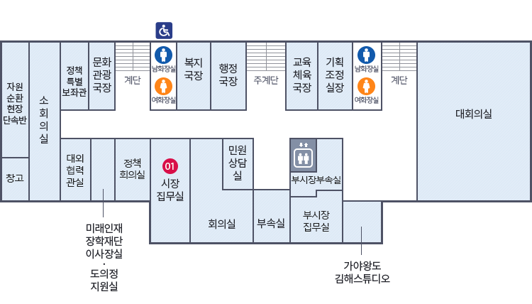 본관 2층 주계단을 중심으로 시계방향으로 교육체육국장, 기획조정실장, 남,여화장실, 계단, 대회의실, 가야왕도 김해스튜디오, 부시장집무실, 부시장부속실, 엘리베이터, 부속실, 민원상담실, 회의실, 01 시장집무실, 정책회의실, 미래인재장학재단이사장실·도의원의정실, 대외협력관실, 소회의실, 창고, 자원순환현장단속반, 소회의실, 정책특별보좌관, 문화관광국장, 계단, 남.여 화장실(장애인), 복지국장, 행정국장 위치해있습니다.이미지 크게 보기