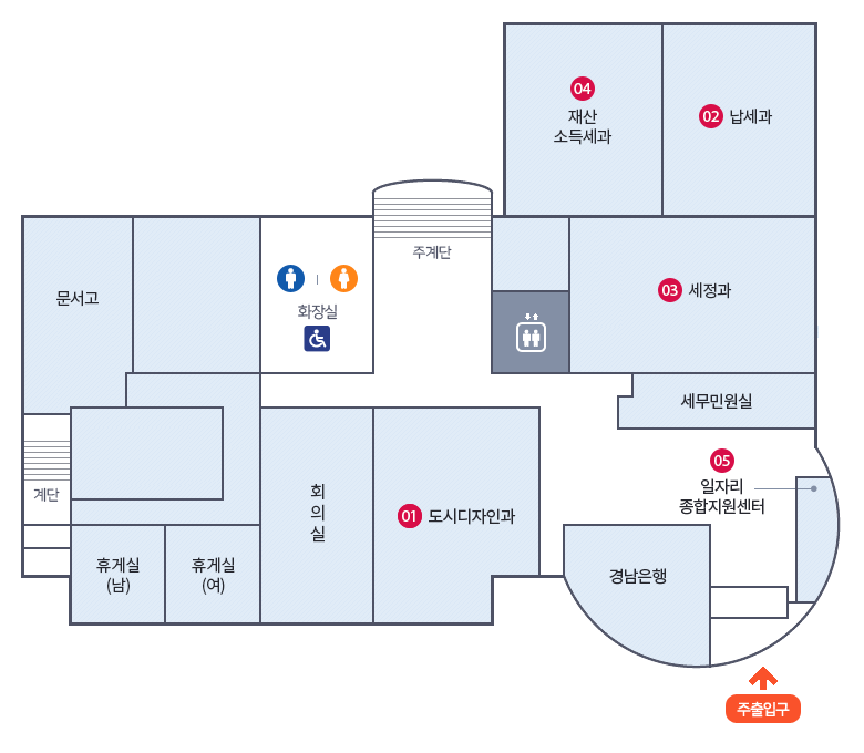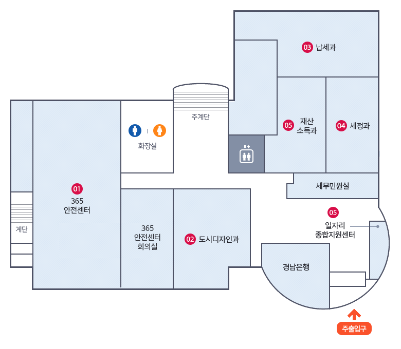 민원청사1층. 주출입구를 중심으로 반시계방향으로 01 도시디자인관, 경남은행, 계단, 문서고, 문서고, 문서고, 남여 화장실(장애인), 주계단, 02 납세과,  03 세정과, 04 재산소득과, EV, 세무민원실, 05 일자리종합지원센터, 기업애로119센터가 위치해있습니다. 이미지 크게 보기