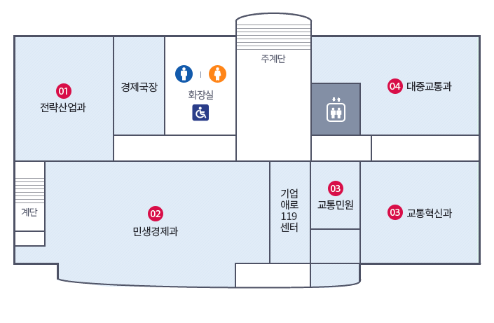 민원청사4층. 주계단을 중심으로 시계방향으로 EV, 05 대중교통과, 04 교통혁신과, 04 교통민원, 03 기업투자유치단, 02 민생경제과, 계단, 01 전략산업과, 경제국장, 남여화장실(장애인)이 위치해있습니다. 이미지 크게 보기