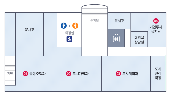 민원청사5층. 주계단을 중심으로 시계방향으로 EV, 동관회의실, 도시관리국장, 03 도시계획과, 02 도시개발과, 01 공동주택과,  문서고, 남여화장실(장애인)이 위치해있습니다. 이미지 크게 보기