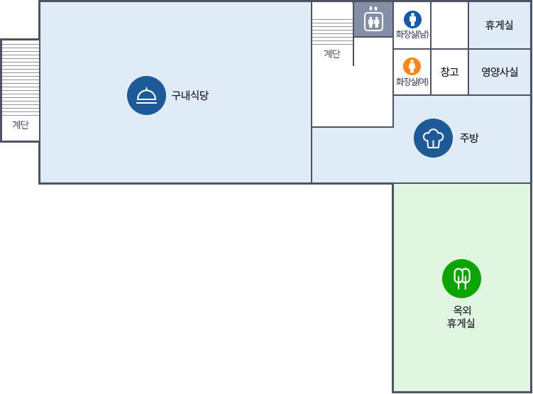 구지관4층은 계단, EV, 화장실(여,남), 창고, 휴게실, 영양사실, 주방, 옥외휴게실, 구내식당, 계단이 위치해 있습니다. 이미지 크게 보기