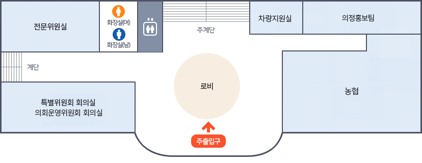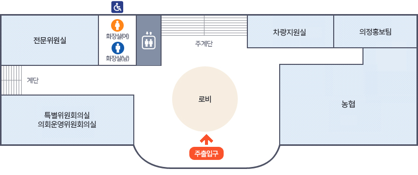 의회1층  주출입구(로비)중심으로 시계방향으로 농협, 의정홍보팀, 차량지원실, 주계단, EV, 여남화장실(장애인), 전문위원실, 계단, 특별위원회의실 / 의회운영위원회의실이 위치해 있습니다. 이미지 크게 보기