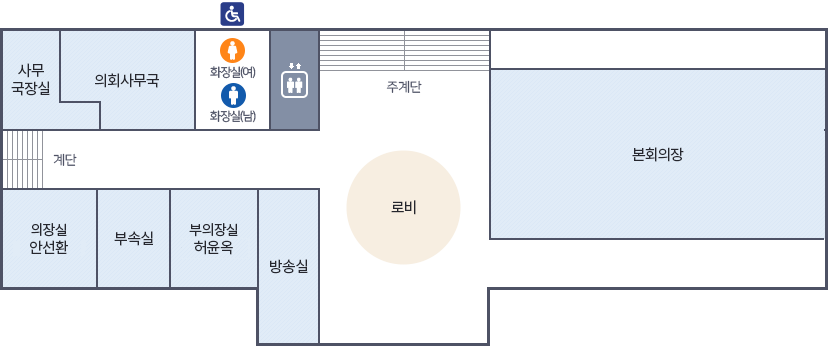 의회3층  주계단(로비)중심으로 시계방향으로  본회의장, 방송실, 부의장실 허윤옥의원 , 부속실, 의장실 안선환의원, 계단, 사무국장실,