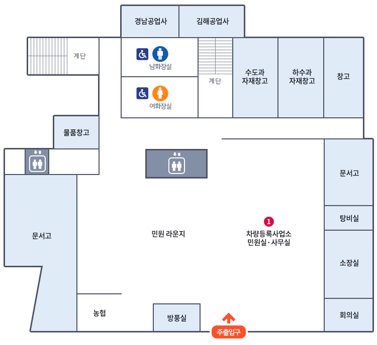 제2청사1층-주출입구, 민원라운지, 1.차량등록사업소민원실·사무실에서 시계방향으로 방풍실, 농협, 문서고,ev,물품창고, 계단, 경남공업사, 남화장실(장애인), 여화장실(장애인), 김해공업사, 계단, 수도과 자재창고, 하수도 자재창고, 창고, 문서고, 탕비실, 소장실, 회의실이 위치해있습니다.이미지 크게 보기