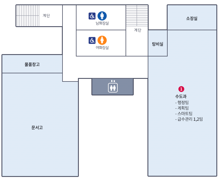 제2청사3층-남화장실(장애인),여화장실(장애인)에서 시계방향으로 계단, 탕비실, 소장실, 1.수도과- 행정팀, 계획팀, 스마트팀, 급수관리1,2팀, ev, 문서고, 물품창고, 계단이 위치해있습니다.이미지 크게 보기