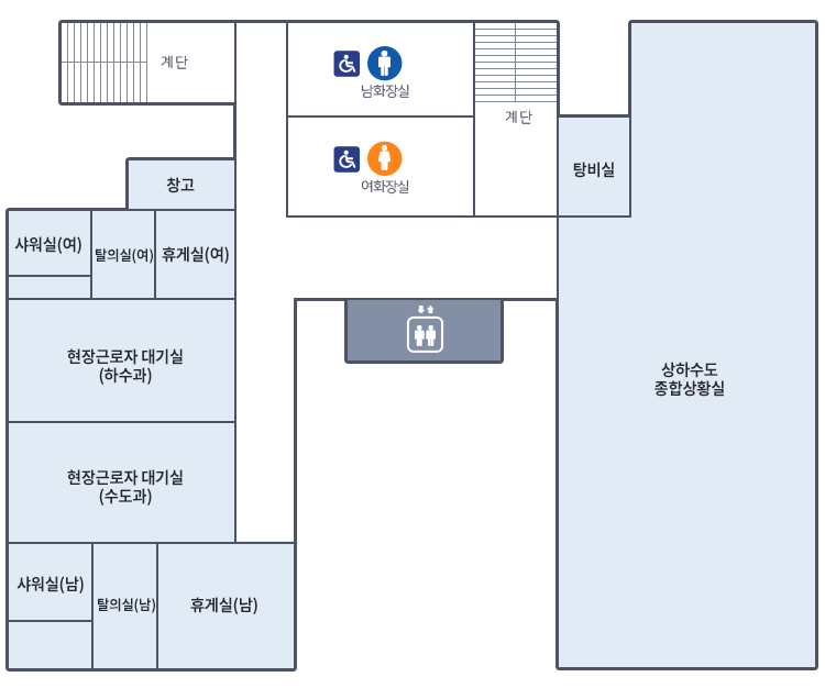 제2청사5층-남화장실(장애인),여화장실(장애인)에서 시계방향으로 계단, 탕비실, 상하수도 종합상황실, ev, 휴게실(남), 탈의실(남), 샤워실(남), 현장근로자 대기실(수도과), 현장근로자 대기실(하수과), 휴게실(여), 탈의실(여), 샤워실(여), 창고, 계단이 위치해있습니다.이미지 크게 보기