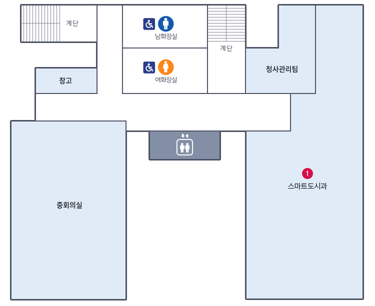 제2청사6층-남화장실(장애인),여화장실(장애인)에서 시계방향으로 계단, 청사관리팀, 1.스마트도시과, ev, 중회의실, 창고, 계단이 위치해있습니다.이미지 크게 보기
