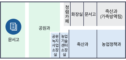 2층안내도 : 왼쪽상단에서 부터 시계방향으로 청렴카페, 화장실, 문서고, 축산과(가축방역팀), 농업정책과, 축산과, 농업기술센터소장실, 공원녹지사업소장실, 공원과, 문서고가 있다이미지 크게 보기