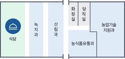 1층안내도 : 왼쪽상단에서 부터 시계방향으로 화장실, 당직실, 농업기술지원과, 농식품유통과, 산림과, 녹지과, 식당이 있다.이미지 크게 보기