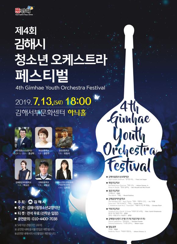 2. 2019. 07. 13 SAT 제4회 김해시 청소년 오케스트라 페스티벌 기간 : 2019.07.13 시간 : 18:00 ~ 20:00 장소 : 김해서부문화센터 하늬홀 주관 : 김해시립청소년교향악단 주최 : 김해시 문의처 : 055-330-3947, 010-4400-7038