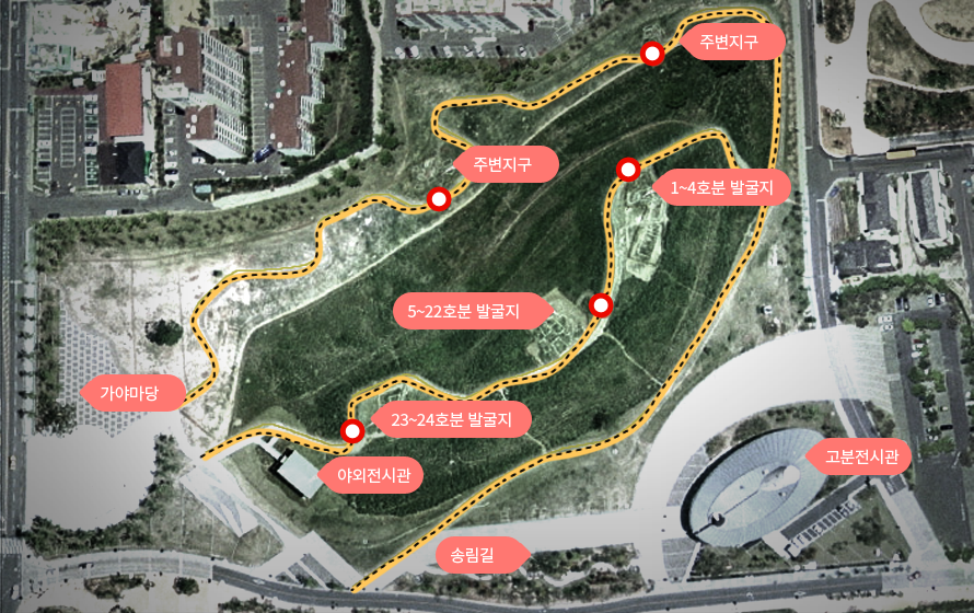 대성동고분군 구릉의 정상부와 주변에 발굴조사된 구역을 탐방할 수 있도록 산책로가 개설되어 있다