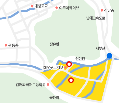 빨간색 동그라미 율하고인돌공원, 파란색 동그라미 율하마을유적 위치