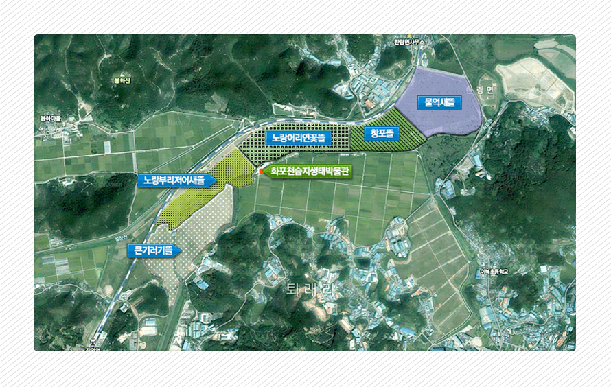 화포천습지은 하천을 따라 형성된 화포천습지의 중, 하류에 위치하고 있다.