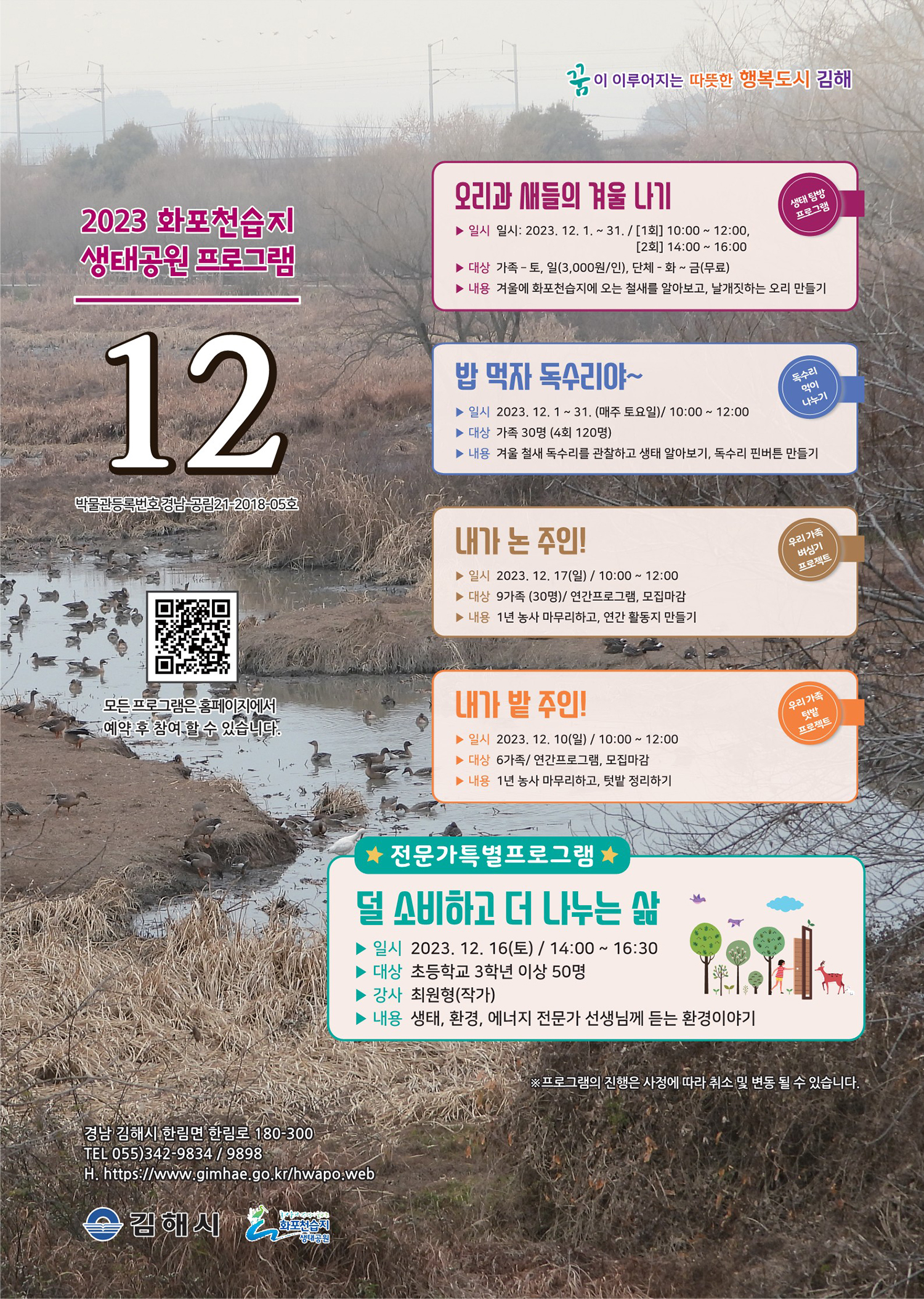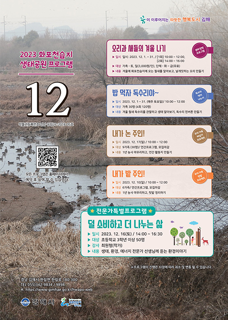 프로그램 예약하러가기(QR코드) 경남 김해시 진영읍 진영로265번길 330 화포천습지과학관 경남 김해시 한림면 한림로 183-300 화포천습지생태학습관 Tel.055-342-9834, 9898 https://www.gimhae.go.kr/