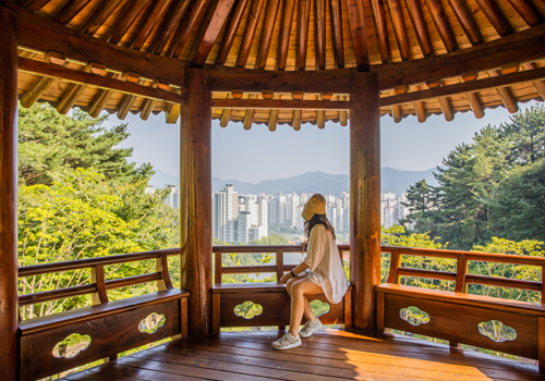 팔각정 정자에서 자연 속 김해 도심 풍경 감상