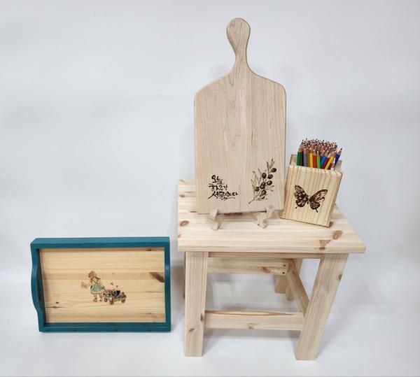 *품목 - 연필꽂이, 우드트레이, 편백나무 도마, 소나무 스툴