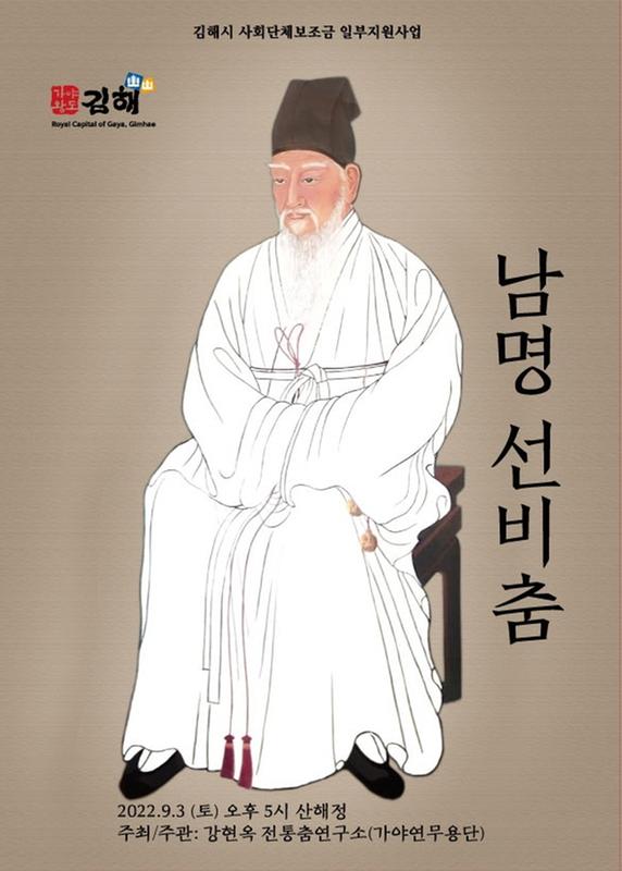 • 9월 김해인물을 한국무용으로 탐사하다 "남명선비춤" ⃝ 일 시 : 2022. 9. 3.(토) 17:00 ⃝ 장 소 : 산해정(신산서원)--> 우천으로 인해 "칠암도서관 공연장" 으로 장소 변경 ⃝ 주요내용 : 2022년 김해시 주민참여예산사업 “김해의 인물을 무용...
