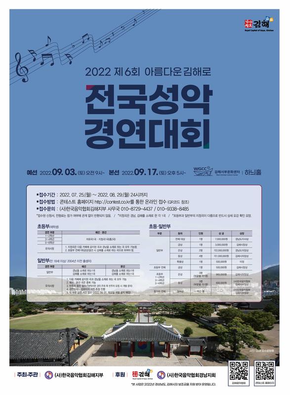 • 9월 제6회 아름다운 김해로 전국성악경연대회 ❍ 대 회 명 : 제6회 아름다운 김해로 전국성악경연대회 ❍ 경연부문 : 초등부, 일반부(만 18세 이상, 2004년 이전 출생자) / 지정곡 및 자유곡 가창 ❍ 접수기간 : 2022. 7. 25.(월) ~ 8. 29.(월) ...