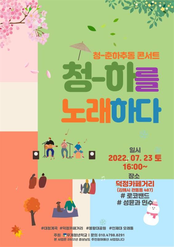 • 7월 게릴라콘서트 "청하(靑夏)버스킹" 개최 ○ 일 시 : 2022. 7. 23.(토) 16:00 ~ 18:00 ○ 장 소 : 덕정카페거리(‘좋아서하는 카페’일대 : 김해시 관동동 487) ○ 주요내용 : 7월의 열기를 달래 줄 율하동 관동공원과 개천인근 산책로에서 ...