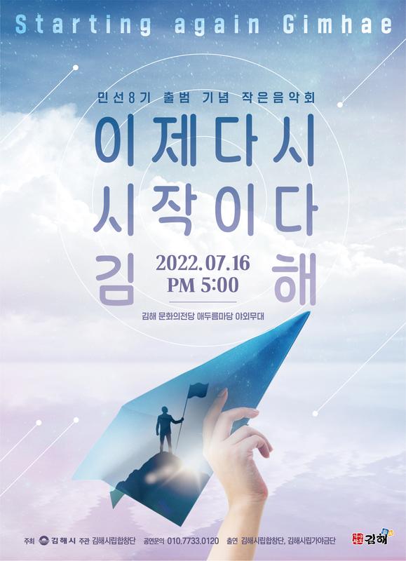 • 7월 민선8기 출범 기념 작은음악회 개최 ❍ 공 연 명 : 민선8기 출범 기념 작은음악회‘이제 다시 시작이다 김해!’ ❍ 일 시 : 2022. 7. 16.(토) 17:00 ~ 17:50 ❍ 장 소 : 김해문화의전당 1층 로비(의자 250석) ❍ 출 연 : 시립합창...