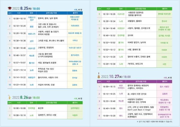 8월 제10회 수로 전국 청소년 예능 콘테스트 가. 대 회 명 : 제10회 수로 전국 청소년 예능 콘테스트 나. 참가자격 : 전국 중․고등학교에 준하는 연령의 동아리, 예능팀, 연합회 또는 개인 다. 참가부문 : 예능팀(①개인전, ②단체전(연합), ③...