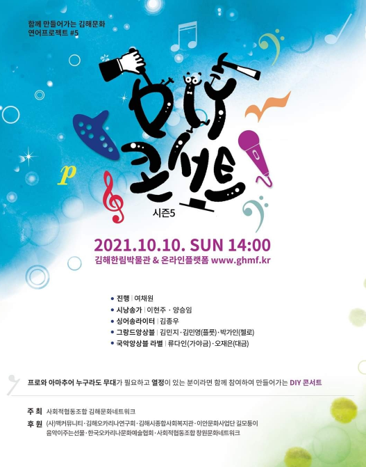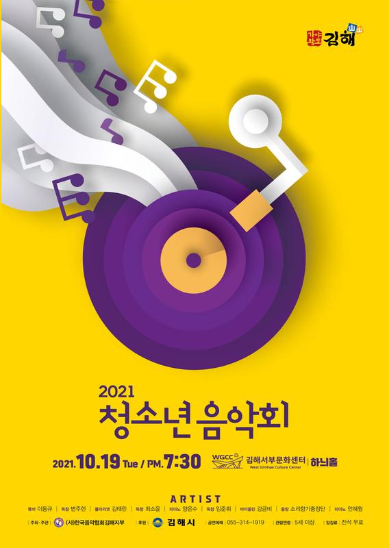 • 10월 2021 청소년 음악회 ○ 행 사 명 : 2021청소년 음악회 ○ 일 시 : 10. 19. (화) 19:30 ○ 장 소 : 김해서부문화센터 하늬홀 ○ 주최/주관 : (사)한국음악협회 김해지부 ○ 후 원 : 김해시
