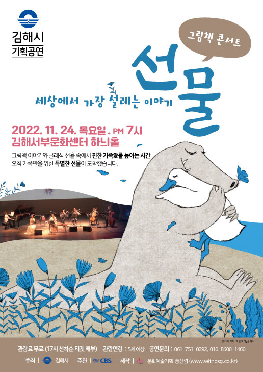• 11월 [엄마, 아빠와 함께하는 우리아이 그림책 콘서트] 세상에서 가장 설레는 이야기 "선물" 0 일 시 : 2022.11.24.(목) 19:00 0 장 소 : 김해서부문화센터 하늬홀 0 주요내용 : 생동감있는 성우 목소리로 그림책 이야기를 듣고, 그림책을 재해석한 샌드아트를 감상하며 융복합...