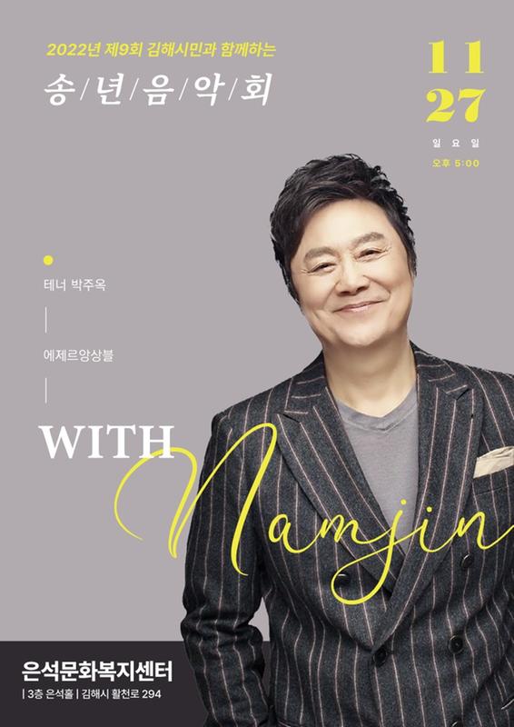 • 11월 2022년 김해시민과 함께하는 제9회 송년음악회 0 일 시 : 2022. 11. 27.(일) 17:00 0 장 소 : 은석문화복지센터 은석홀(활천로 294) 0 주요내용 : 가수 남진, 테너 박주옥, 에제르앙상블 공연 0 입 장 료 : 전석 3만원, 8세 이상 관람가 ※ 입장료 ...