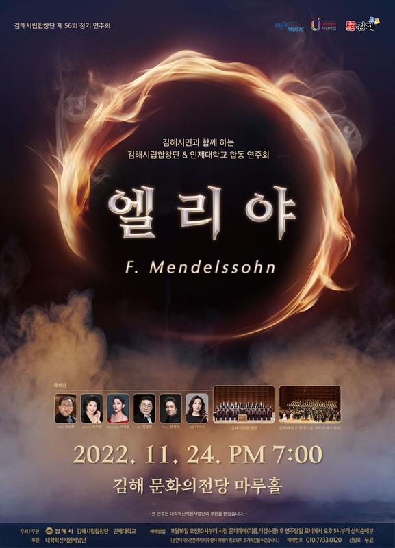 • 11월 김해시립합창단 제56회 정기연주회 개최 ❍ 공 연 명 : 김해시립합창단 제56회 정기연주회 F. Mendelssohn “Elijah” ❍ 일 시 : 2022. 11. 24.(목) 19:00 ~ 20:50 ❍ 장 소 : 김해문화의전당 마루홀 ❍ 출 연 : 시립합창단 48명, 인제대학교 ...