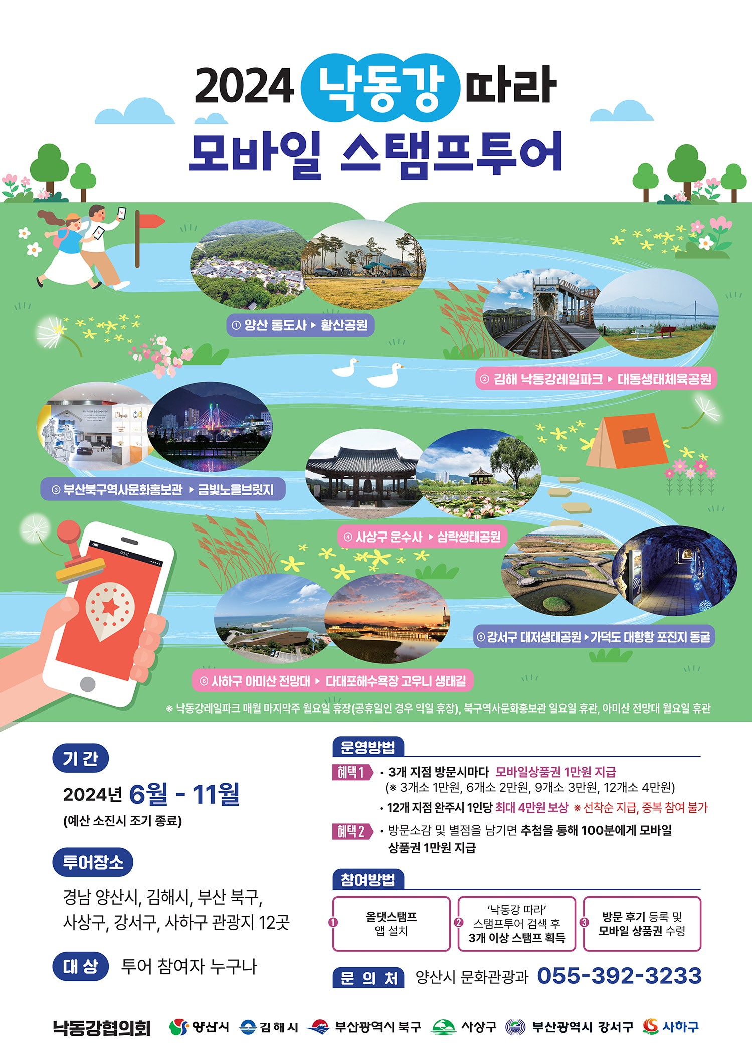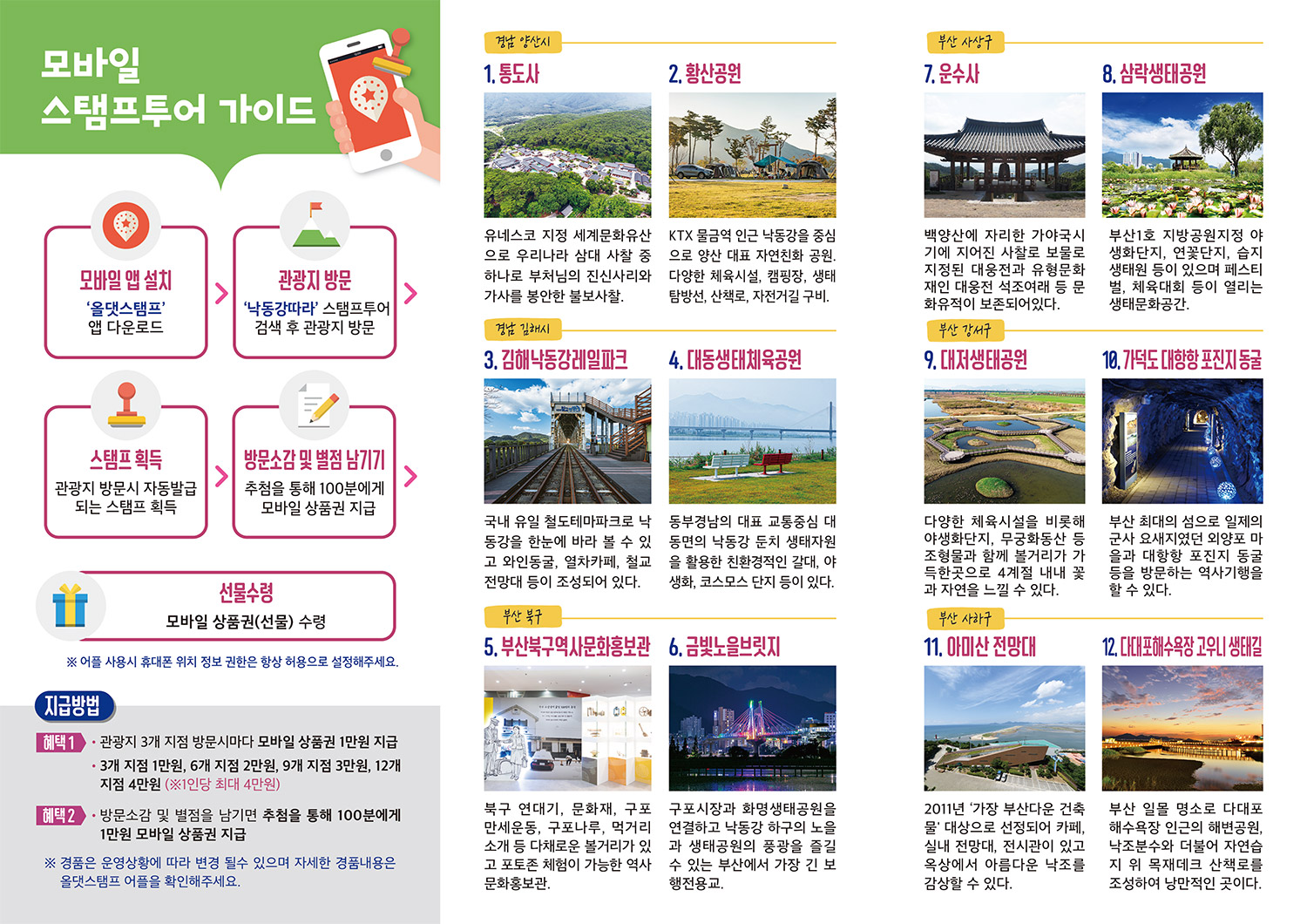 • 올댓스탬프 앱 다운 및 회원가입 → "낙동강 따라" 검색 후 관광지 방문 → 3곳 이상 방문 인증 시마다 모바일 상품권 지급 등
